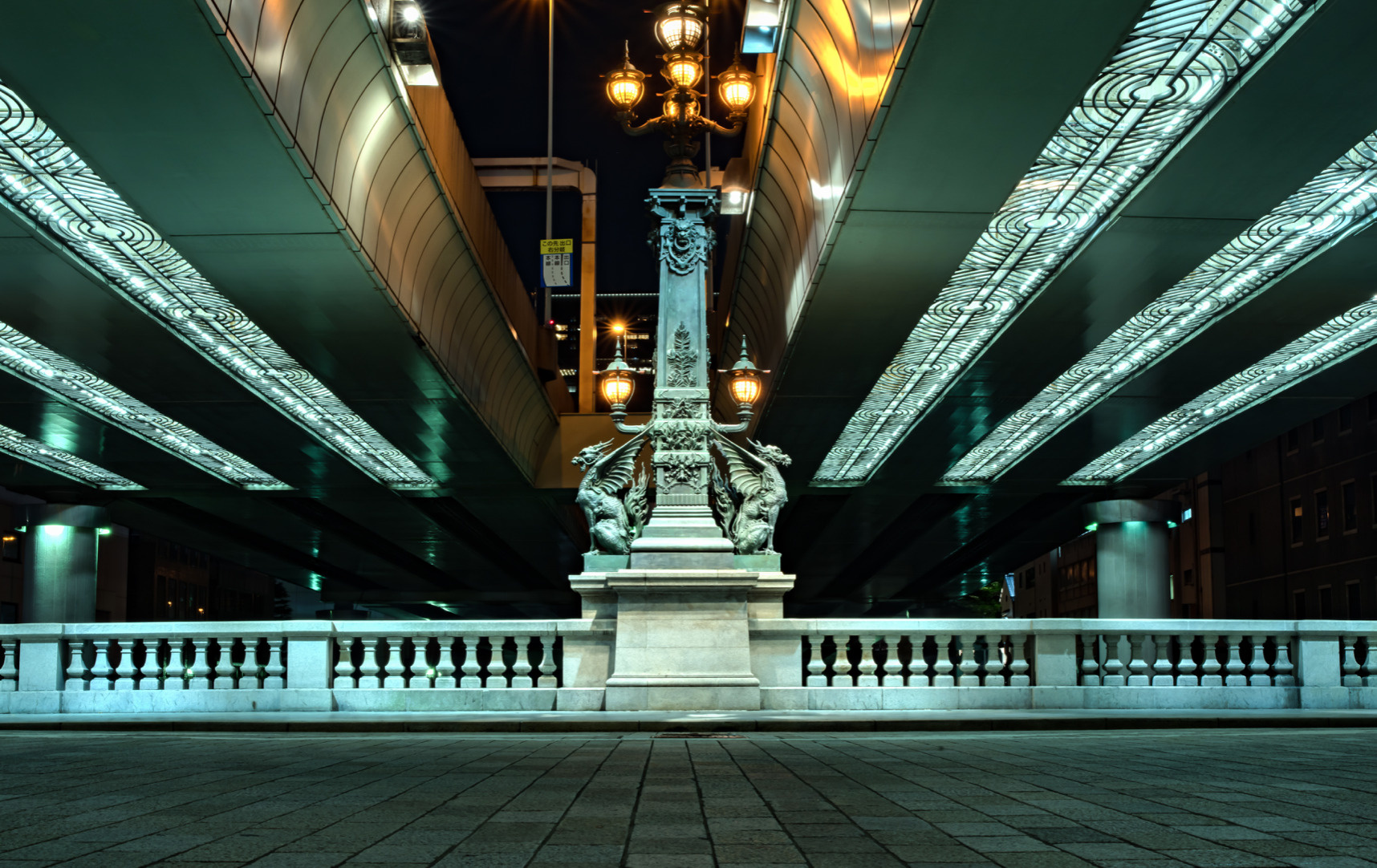 写真の麒麟(きりん)像は、この日本橋の中央にある青銅製の照明灯の足元を飾っている。