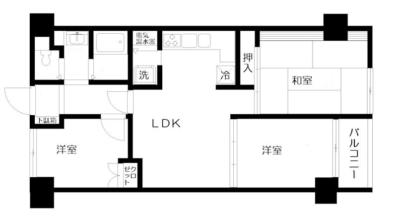 室内洗濯機置場、バルコニー、ガスコンロ、コンロ2口以上、システムキッチン、コンロ3口、バス・トイレ別、洗面台、エアコン、シューズボックス